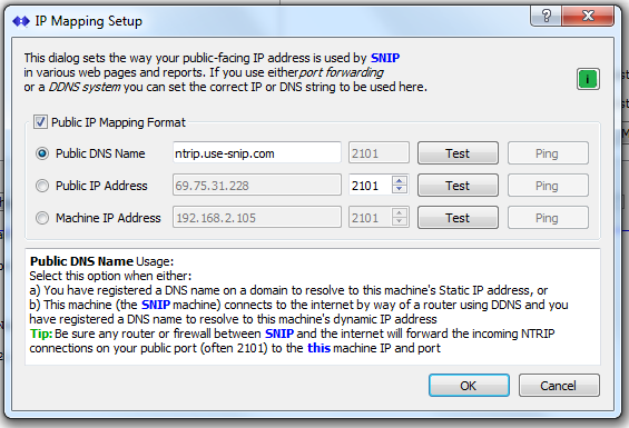 Often a SNIP NTRIP Caster is run on a machine which does not have a static IP address assigned to it. This article reviews three ways to set the link address used in various reports created by SNIP. If your copy of SNIP operates behind a firewall, or is using Dynamic DNS (DDNS), or uses a router or DSL modem to connect to the internet, or has a DNS entry rather than just an IP address – then use this dialog to map the public IPs values seen by various public reports in SNIP.