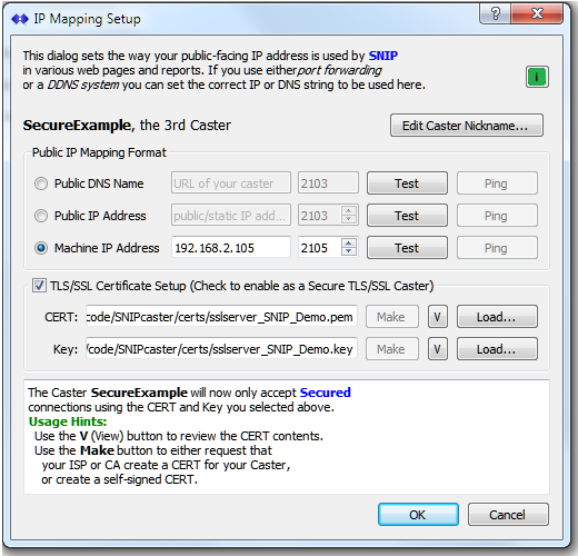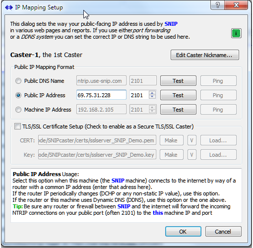 The major choice is which of the three format styles is to be used. The values for each choice are enabled for editing when the radio button is selected. Along the right side of the dialog box is a set of test buttons to allow the SNIP operator to confirm that other parties (on the public internet) can contact and connect to this NTRIP Caster over the public internet using those settings.
