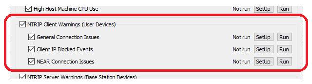 Each functional area can be enabled / disabled by checking / unchecking the associated check box. Each SetUp button brings up a control dialog where the threshold behavior of that function can be set. For this group of functions the triggering moment is related to when the NTRIP Client connection occurs. Every time an NTRIP Client connects the logs are checked for prior connections and any limits which have been exceeded before sending a warning eMail out. The Run button causes a summary report to be created. The Run Now button (at the bottom of the dialog) can be used to process all the active functions and send a report.