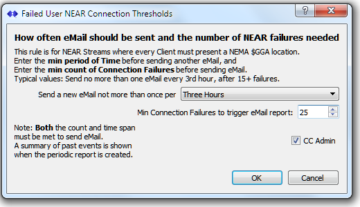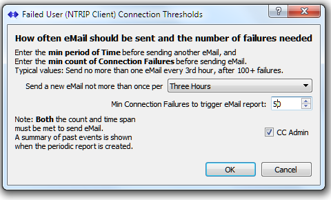 The setup dialog allows you to set the number of bad connections which must occur before eMail is sent. You can also set how often another email wold be sent to any connection which continues to make this error. You can also CC the operator (or not) on these emails.