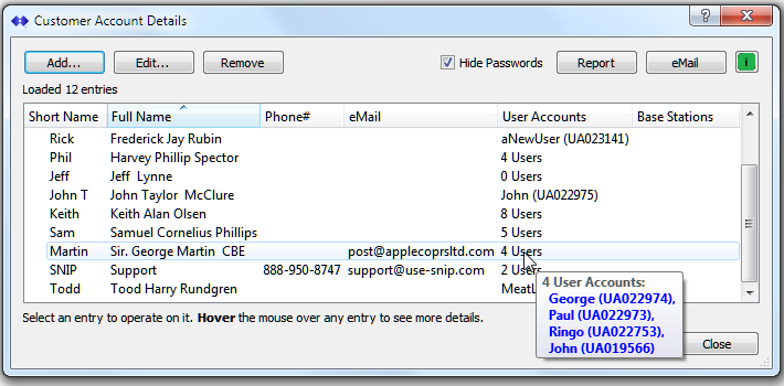 Every NTRIP Client connection to the Caster (every user), requires a valid user name and password to connect (unless you are running your Caster in an open mode where no user account is required to connect). This is called a User Account. In Pro models of SNIP, this account can be ‘owned’ or assigned to a Customer Account which is used to manage additional contact information (phone, eMail, etc.) and business details. The use the Customer Account features is entirely optional, but of significant convenience.