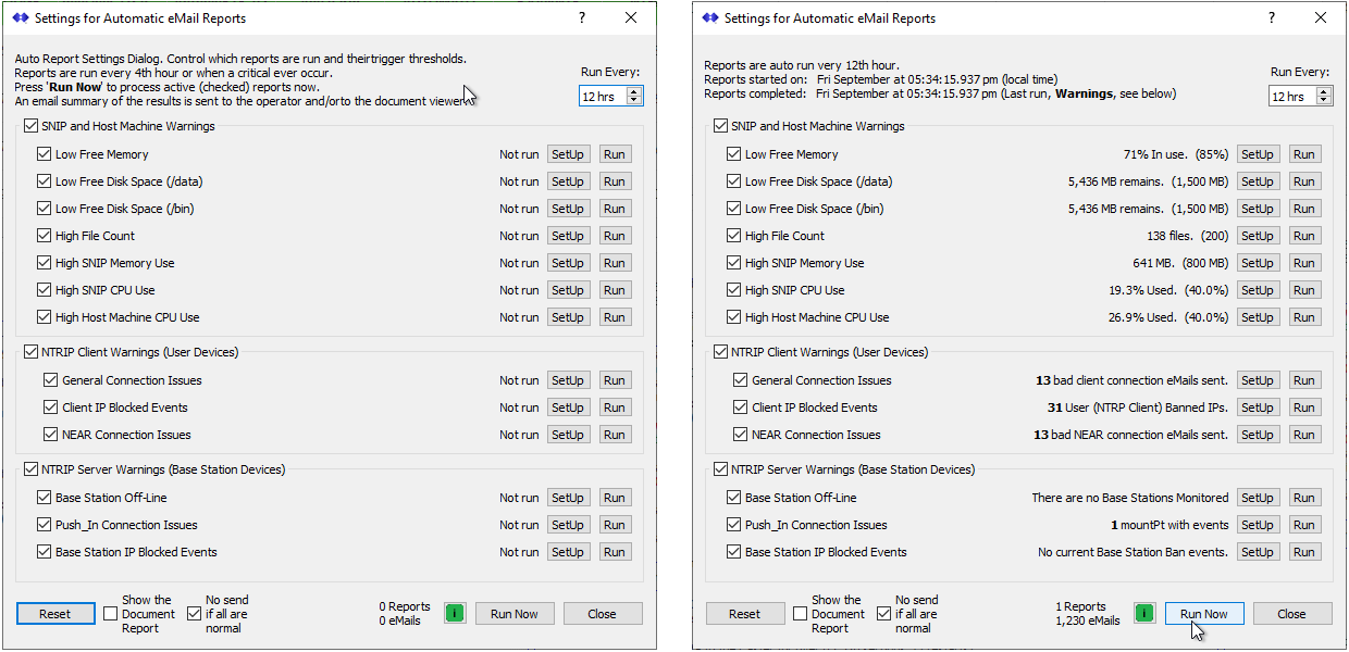 The primary dialog is shown below in two states (click to enlarge). On the left is shown the dialog as it first appears when SNIP is started. On the right is a representative view after the various reports have been run. Each report is summarized in one line in this dialog. The actual eMail sent contains the full report of the current event(s). Often sufficient information is presented there to allow tech-support staff to assist users (NTRIP Clients) without the need to access SNIP itself and review the console logs or other reports.