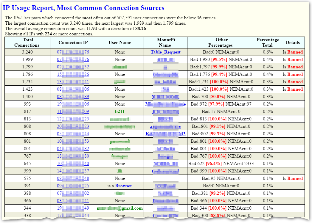 The report shows the source connection IP, the user name for the account, the MountPt name of the Base Station involved, and other key details. It is sorted from the most frequent to the least. It displays the first 80% of all connections. This threshold value has proven to provide sufficient summary data. [Hint: If you want to see EVERY connection that has occurred with EVERY IP, use the IP Address Report.] Some statistical information is also provided in the header.