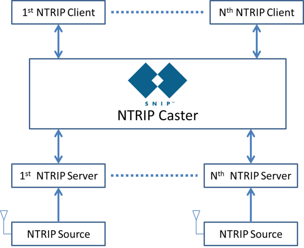 As you read about NTRIP (see the short article list below), you will often see variations of the below image used to explain the major component of any NTRIP system. SNIP is an NTRIP Caster, which allows you to set up your own network consisting of the data sources you provide (various NTRIP Servers and other sources) to your end users, the NTRIP Clients. all connecting by use of the internet and local cellular services.