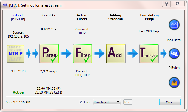 • This release of SNIP features the first official release of the P.F.A.T.™ control process developed for Enterprise users and now present in both Basic and Pro models of SNIP  (as well as for Evaluation use).  The PFAT controls are explained further in their own section of the knowledge base.    PFAT allows the manipulation of each RTCM 3 message stream in several ways to create specific message content for different users communities.   As explained further in the knowledge base, the message found in a Base Station can be filtered out, or added to, or translate in various ways.   Additional transformation methods form a major part of the SNIP Rev 2.x feature road-map.