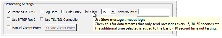 The logic for connections to support slow data streams (streams that only send new message content every few seconds) was improved and some processing problems were corrected. This type of stream is most commonly found with State Space Representations (SSR) messages where a new set of values may only be sent every 10~60 seconds or even slower. To learn more about SSR and it’s use with PPP and RTK, see this article. The slow logic has also been extended for use with data streams that are not treated as parsed RTCM3.