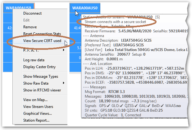 A certificate (CERT) is considered valid when all of its parameters (such as the domain name on which it can be used) match the host machine using it, when its expiration time has not past, and also when some other entity that you (your host machine) already trusts says the CERT is valid (and is not revoked). Each of these steps are automatically performed when the CERT is presented during an initial negotiation phase of the connection. These steps are considered further in a moment, and a dialog is shown to the operator if any problems are encountered. Another part of the initial negotiation is to determine how the data will be encrypted for transfer. The CERT lists a number of cipher suites it supports and the client selects which will be used after the negotiation completes. [Aside: When data is transferred from the NTRIP Caster to the NTRIP Client, each packet of data is block encrypted, typically with AES methods. So the size of the data sent (and therefore the bandwidth required) is not increased by using a secure connection. An important detail for wireless data connections.]