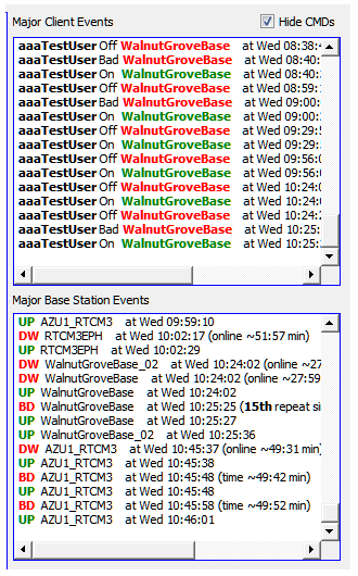In the display at the right, the upper window shows a user (aaaTestUser) connecting to the Base Station WalnutGroveBase multiple times over a span of ~2 hours. The lower window shows the WalnutGroveBase Base Station being offline during some of that same period of time. The connection to the source of this base had to be repeated 15 times before it was again established. The Base Station AZU1_RTCM is also shown going offline several minutes later.