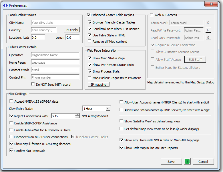 The misc. settings group is used to control the rate at which “dead” remote-relay data streams are retried. And it is also used to control certain flags in the resulting Caster Table that control how or if NTRIP Clients will send their estimated locations back to the SNIP Caster.