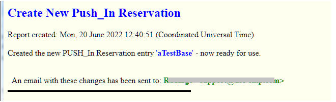 When the form is submitted (press the Update the Reservation button), the new Push-In reservation is created and an email with similar details is send to the Admin and the owner of the account (if the eMail Plug-In is active)   See the below image.  If there are any creation problems, a page with a summary of  the errors is presented.
