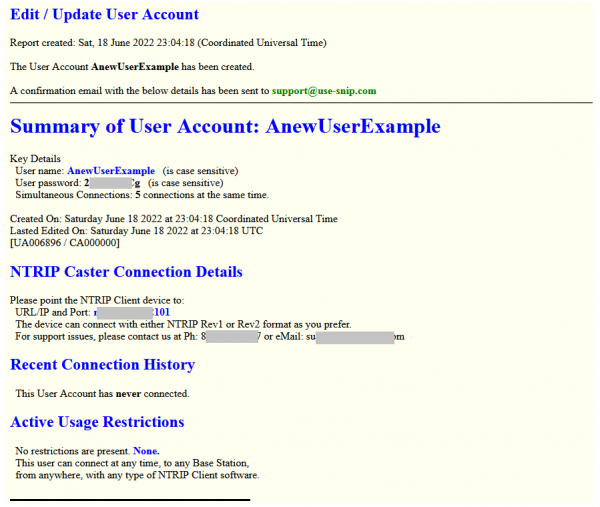 This article describes the step-by-step process to remotely add a new User Account (NTRIP Client) to the Caster.  When the Web API Plug-In is present, SNIP allows adding new User Accounts remotely with a browser.  For the Caster Admin account this process is never limited (you can create as many NTRIP Client accounts as you wish).  For Customer Accounts, the number of Users which can be added by that Customer is limited by the value set by the Caster Administrator for the Customer.   An active Web API Plug-in is required for this feature.  First Login from an authorized account with read-write privileges, not with read-only privileges.