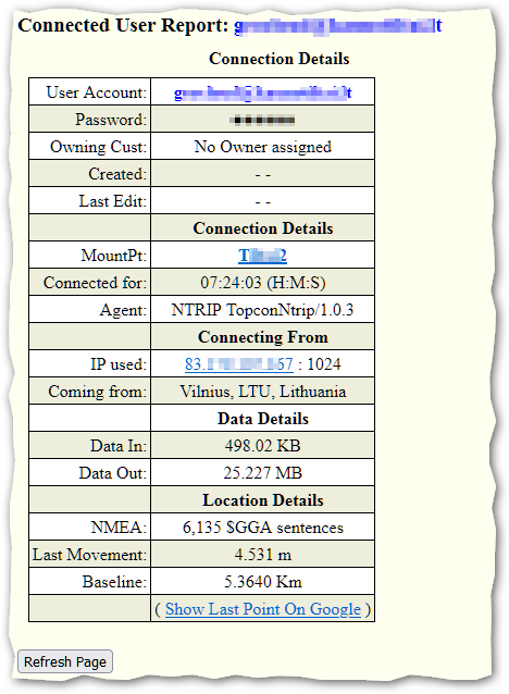 The first section of the report contain a table of key values for the user connection (along the left side).  The user account name and the Base they are connected to are shown. The IP by which the user connects is also shown.  Links are provided to these to see other reports.  The gross location of the user (City/Region/Country) is also shown when known (this uses a reverse Geo lookup process).  Various details about the connection and the data exchanged are also shown.  The button Show Last Point on Google produces a map in its own web page which you can pan and zoom when pressed.
