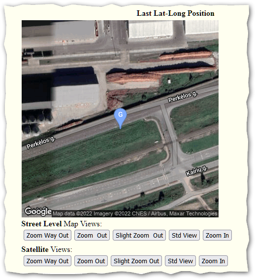 The second section (along the right side) shows the last reported position of the User on a small map. The buttons below the map allow selecting five different preset levels of zoom and if the underlying base map will be a road map or an image (as is shown here).   The default initial map style can be set in the Preferences dialog.