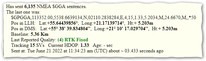 The third section shows a summary of recent NMEA $GGA data including the reported RTK fix mode.  The NMEA lat-long format of DDMM.mmmm is displayed in other common formats.  The baseline to the current base is shown.  And details about the navigation solution reported by the device are also shown.