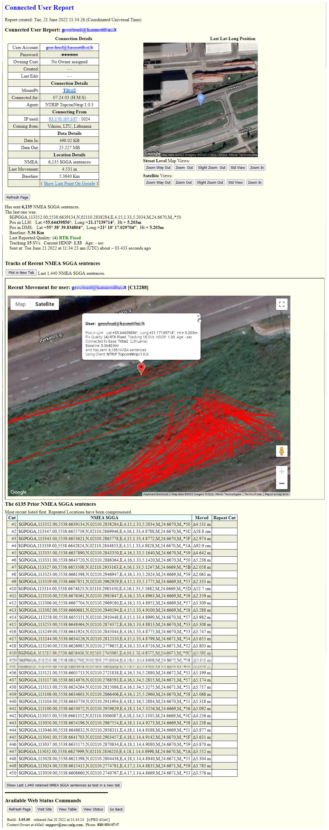 The first section of the report contain a table of key values for the user connection (along the left side). The user account name and the Base they are connected to are shown. The IP by which the user connects is also shown. Links are provided to these to see other reports. The gross location of the user (City/Region/Country) is also shown when known (this uses a reverse Geo lookup process). Various details about the connection and the data exchanged are also shown. The button Show Last Point on Google produces a map in its own web page which you can pan and zoom when pressed.