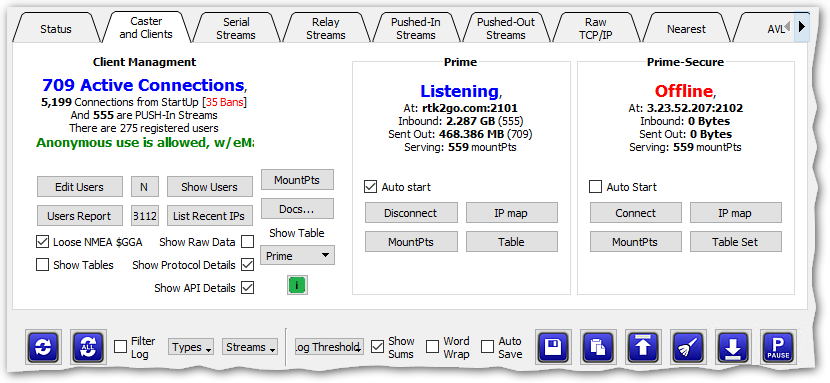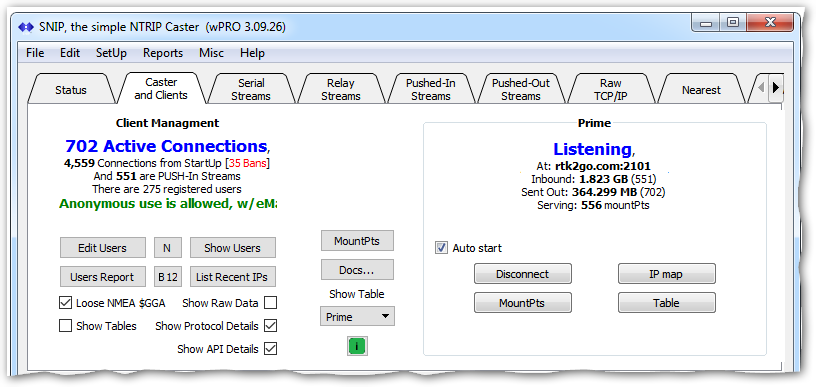 The Caster and Clients tab is used to quickly see and control how many clients are connected, and to see and control the overall state of the Caster itself. Controls for basic SNIP setup for User Accounts (NTRIP Clients) and the Caster IP configuration can be accessed and set from here.